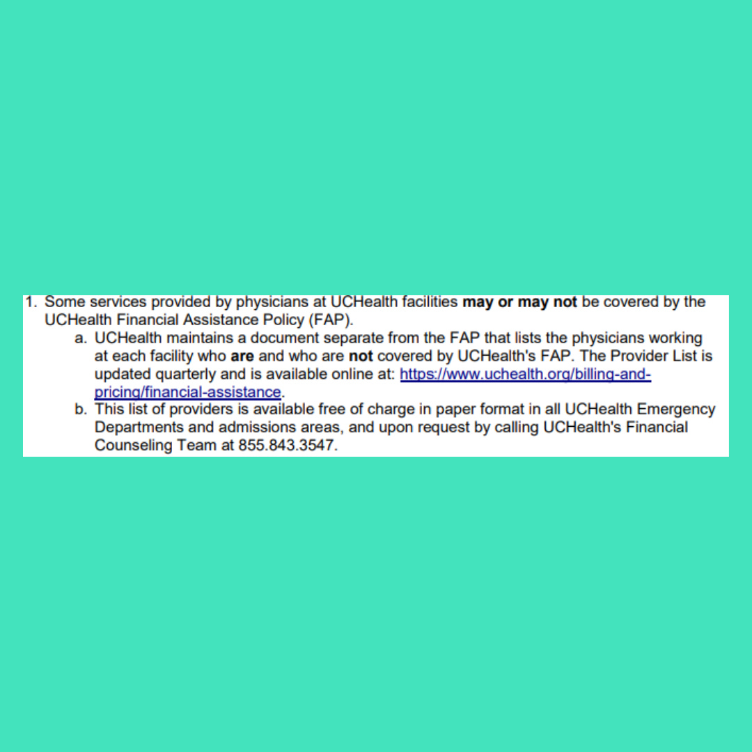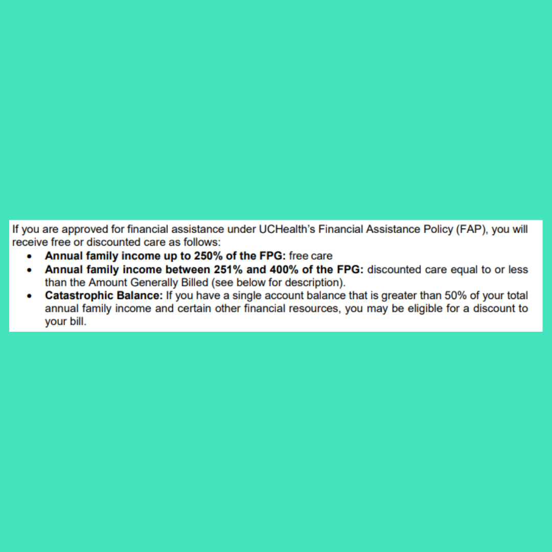To recap, like super quick. UCHealth has a bunch of money, spends money on lots of buildings and stuff, has a very challenging financial assistance policy, and sues people for 3 months worth of your car payment.