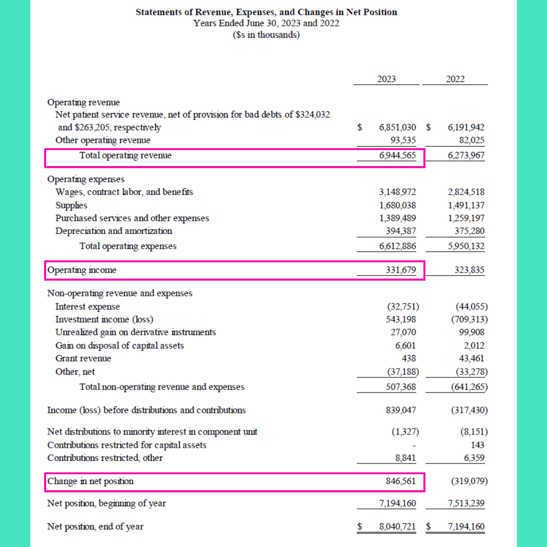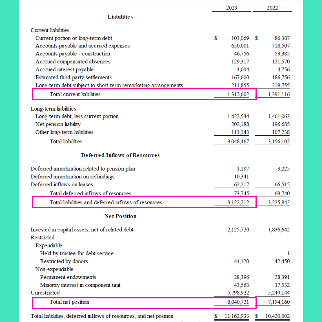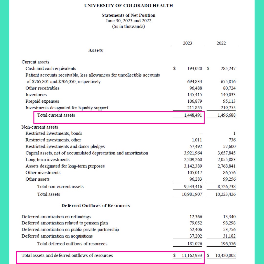 On the liabilities side, nothing crazy, just a sly $1.3B in current liabilities and $3.1B in total. That puts UCHealth’s net position, or equity, at a peachy $8B.