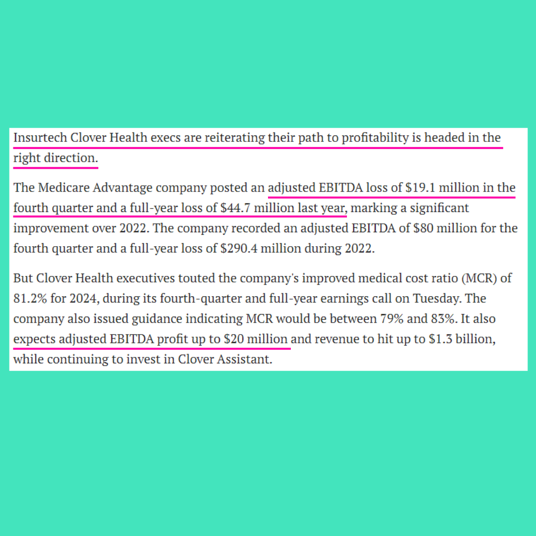 All righty. Since you, like me, have lot’s of time on your hands and just wait for healthcare news to come across your doom scroll, you probably saw Clover Health’s recent earnings call. Or listened to it? Either way, you heard (read? ugh) that Q4 and FY 2023 were MUCH better than previous years.
